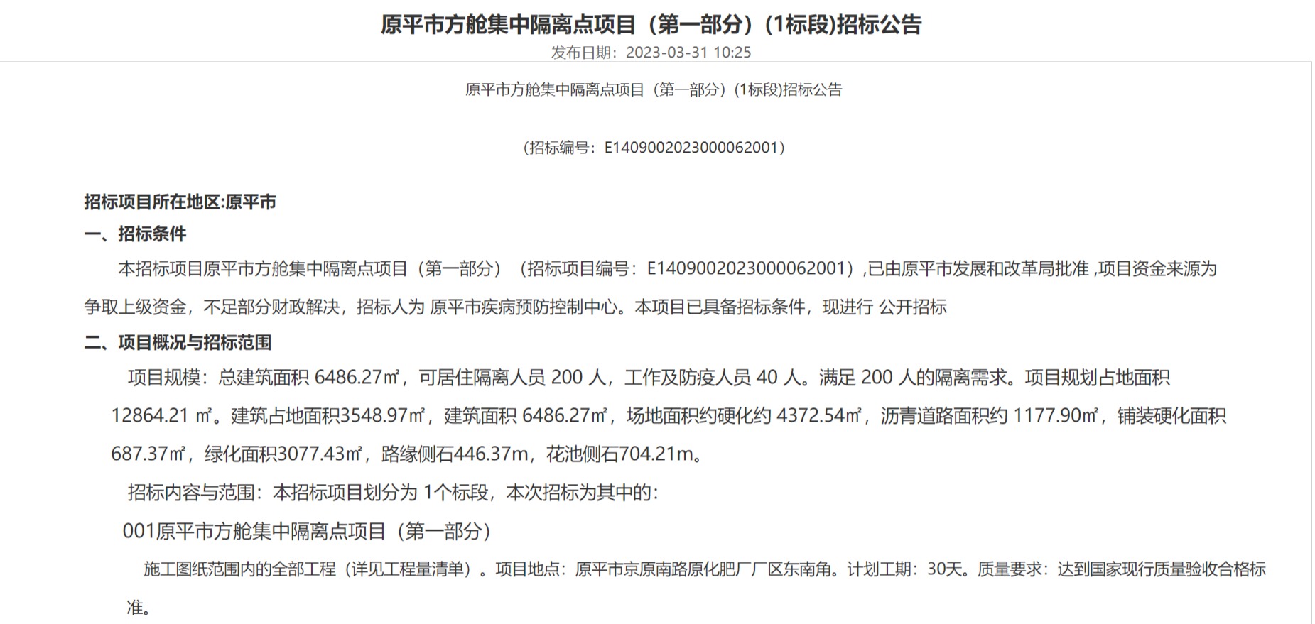 澎湃新闻(www.thepaper.cn)查询全国公共资源交易平台(山西省)发现,忻州下辖的原平市也有一方舱集中隔离点项目不久前刚刚完成部分招标。
