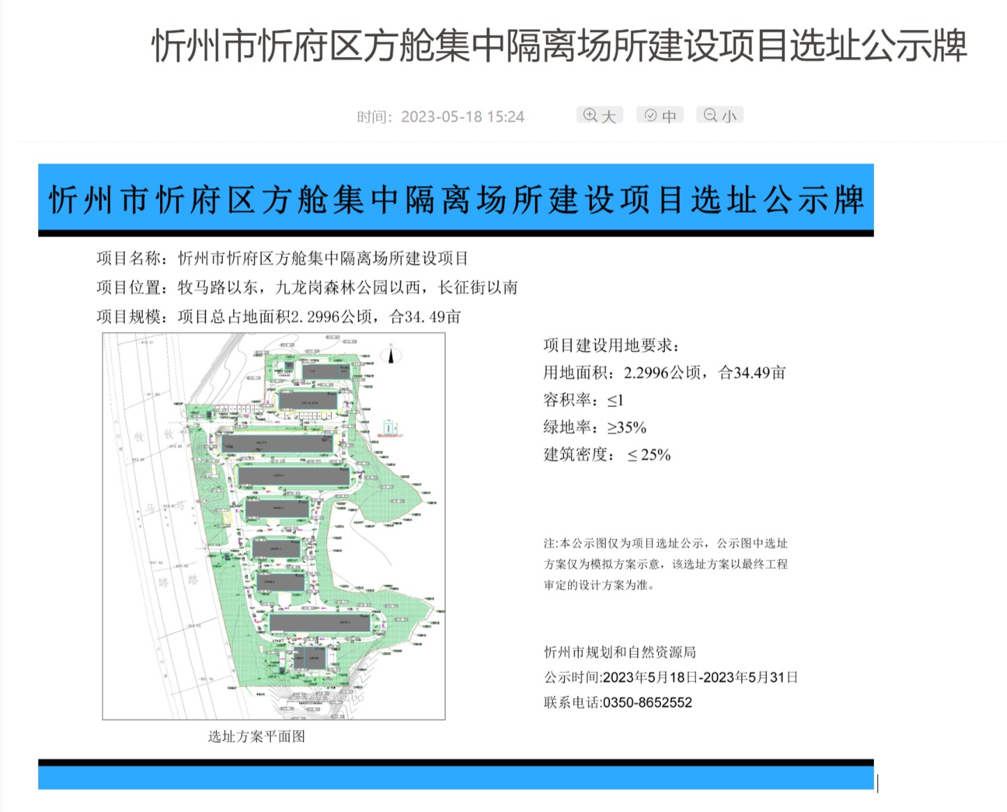 5月18日,山西省忻州市规划和自然资源局官网发布了《忻州市忻府区方舱集中隔离场所建设项目选址公示牌》。