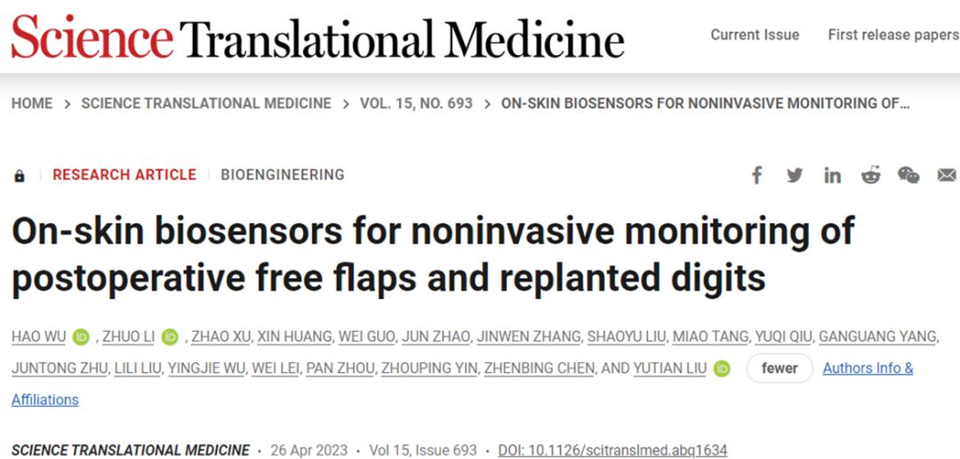 Science子刊:吴豪/刘玉田/李卓合作开发用于非侵入式监测术后游离皮瓣与再植断指的表皮生物传感器