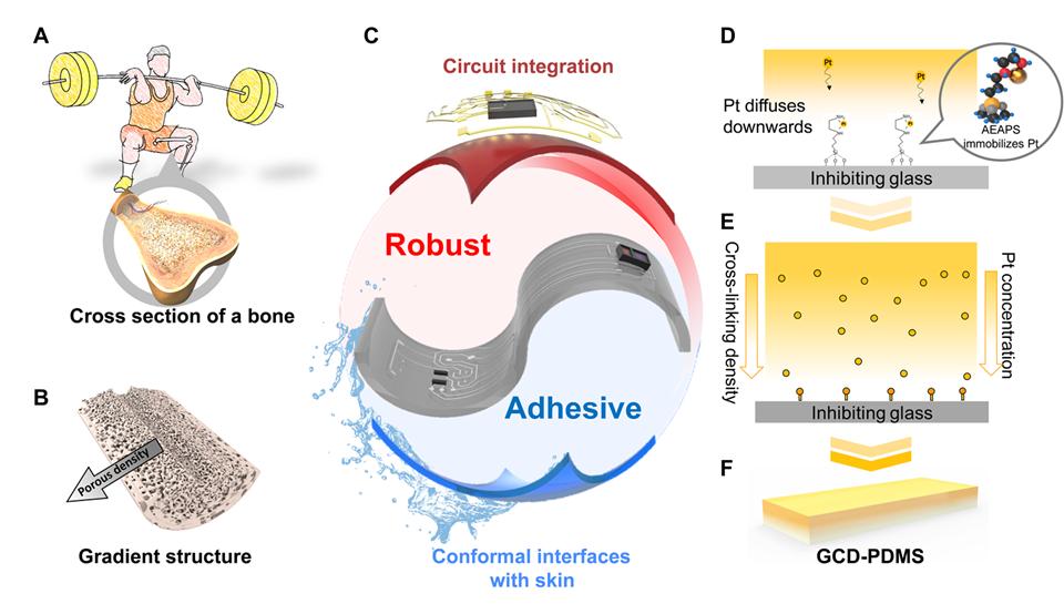 表皮生物传感器的设计与测量性能研究团队受自然梯度结构的启发,通过调整铂(Pt)催化剂的扩散过程,制备出既具有自粘性又可稳定集成硅基芯片的具有梯度交联密度的PDMS(GCD-PDMS)。GCD-PDMS的一侧保持可调的粘性,使得传感器可以与皮肤保形接触以进行精确测量,同时通过对梯度固化的调节,可以保证粘性不致过大,从而保证器件从皮肤剥离时术后组织不受损伤。同时,GCD-PDMS的另外一侧可以保持较高的交联程度,维持较高的硬度和良好的机械性能,能够集成硬质硅基芯片,实现系统的柔性混合集成。