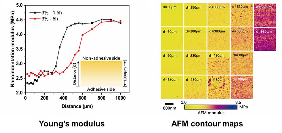 梯度固化界面的设计原理与功能详细阐述了梯度固化的原理和调控方法,并通过GCD-PDMS横截面方向的硬度与模量的测试验证了梯度固化的效果。同时展示了GCD-PDMS粘性一侧的粘性可调特性。