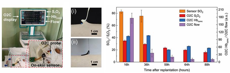 GCD-PDMS梯度固化的实验验证验证了GCD-PDMS界面的生物兼容性,利用大鼠血管阻塞模型,证明了传感器测量血运的准确性和有效性。临床研究表明,表皮生物传感器在识别微血管血运状况方面比目前的临床方法更准确,反应更快。通过与激光多普勒血流法和组织氧测量法(O2C系统)比较,进一步验证了传感器的准确性和识别动脉和静脉血流灌注功能不全的能力。同时,通过对比展示了表皮传感器无线、便捷、对脆弱组织造成损伤小的优势。