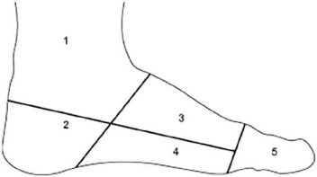 脚踝(第1区),脚跟(第2区),足背(第3区),足底(第4区),脚趾(第5区)