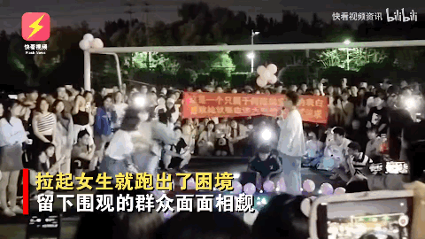 冲进人群的女孩,在大家的起哄声中,拉着好友的手奋力逃跑。