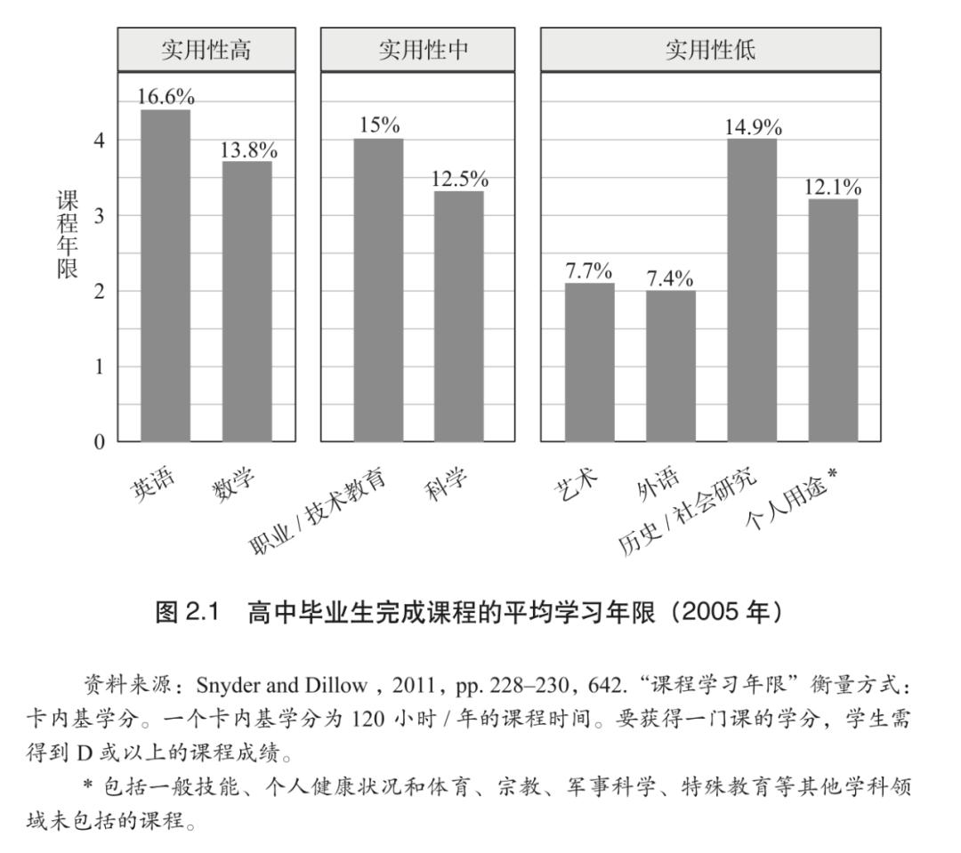 图源《教育的浪费》“实用性高”意味着该科目知识能提高学生在具大多数职业上的工作表现,班上大部分学生以后都用得上,但学生们花在这些科目上的时间,还不超过三分之一;