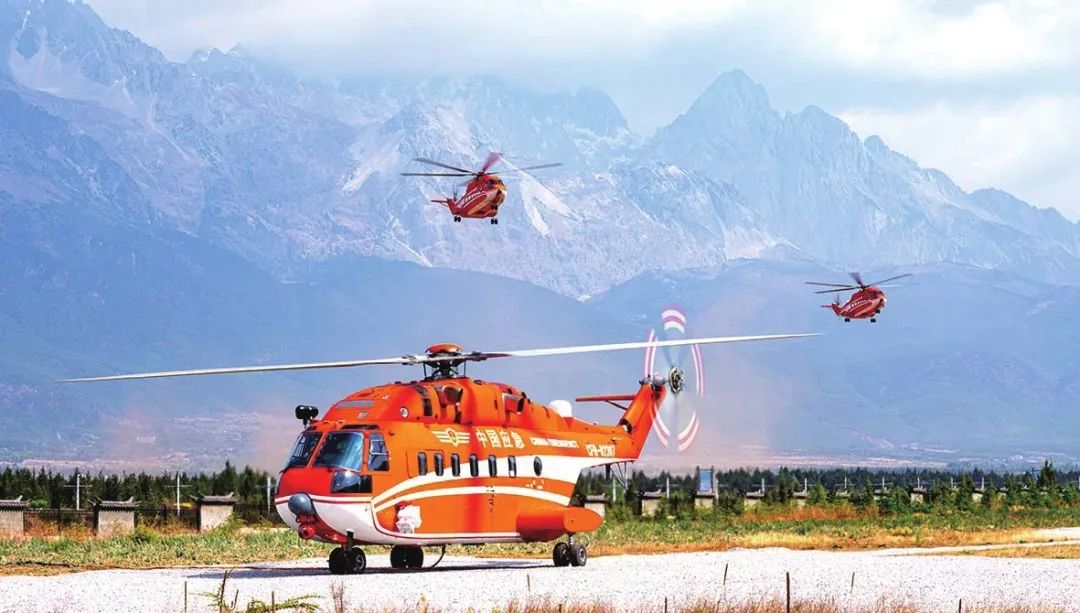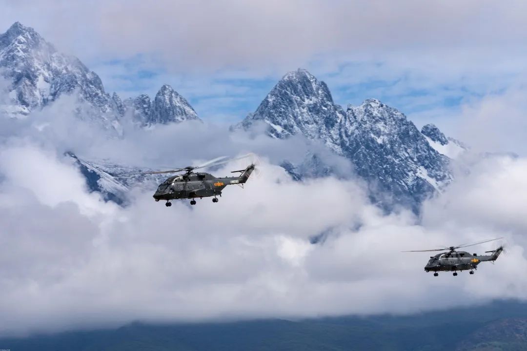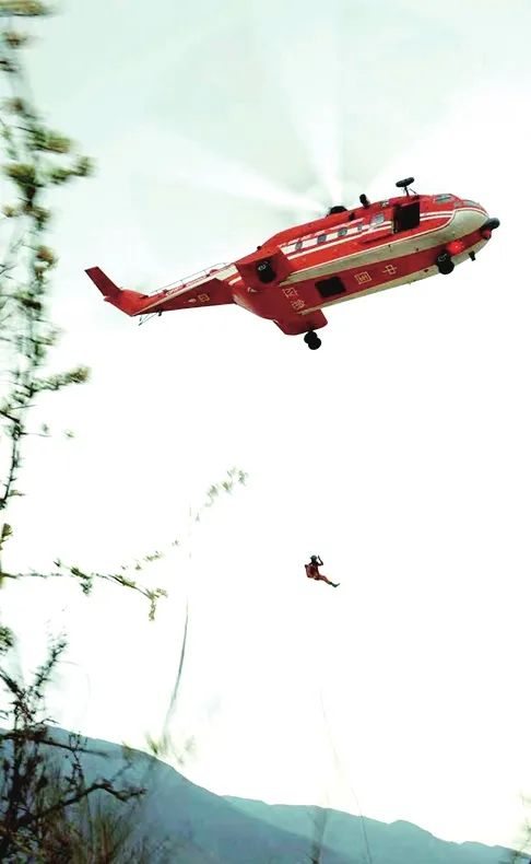 ▲航空工业研制的直8L直升机针对高山峡谷地区人员进入极难与应急通信组网要快的突出问题,演习构建了大小结合、高低协同的应急指挥通信空中保障体系。