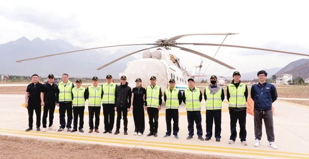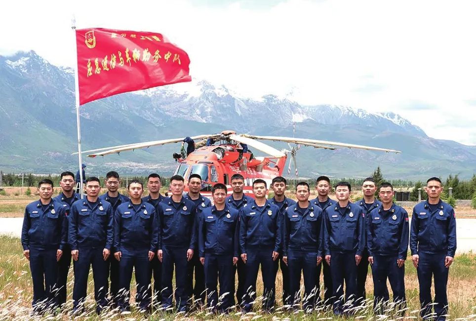 ▲昆明航空救援支队部分保障官兵,身后为航空工业研制的直8A直升机
