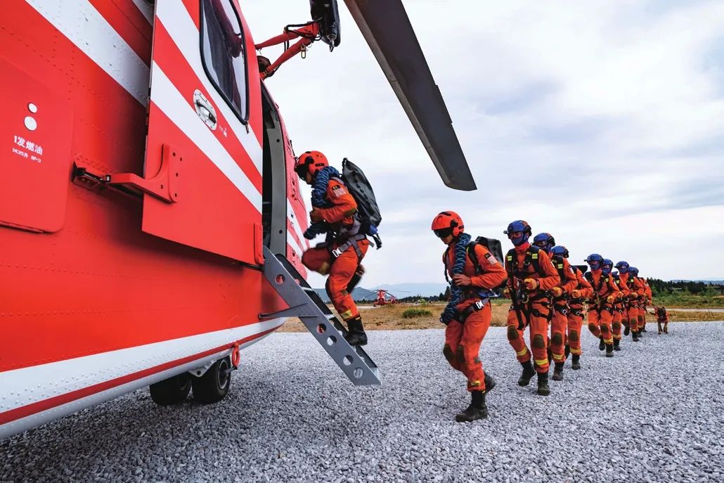 ▲昆明航空救援支队特种救援大队16名救援队员、2只搜救犬分别登机直8A在侦察完灾情后,“森林消防16名特勤队员开舱门、放绳索、设挂锁、接卡扣,从天而降”,特战队员们选取开阔平整地带,快速开辟临时起降点,为直升机机降、应急物资投送做好场地和引导准备。