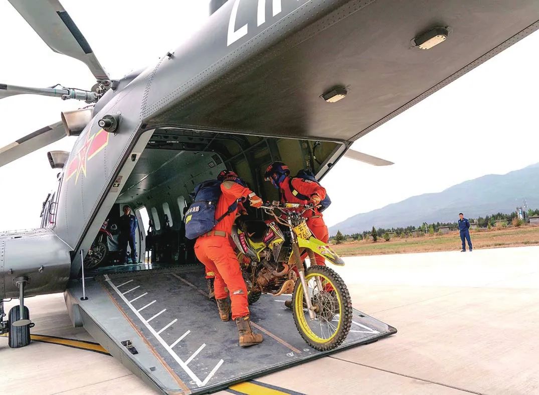 ▲云南森林消防总队8名救援队员、8辆摩托车分别载入2架直8L直升机