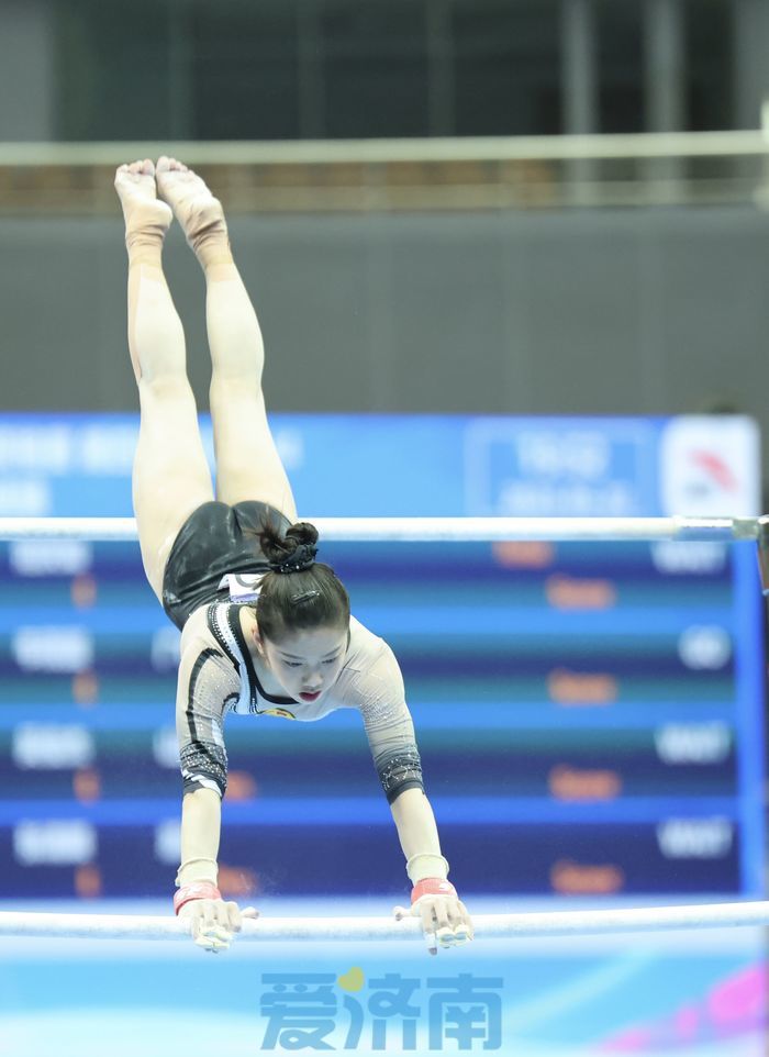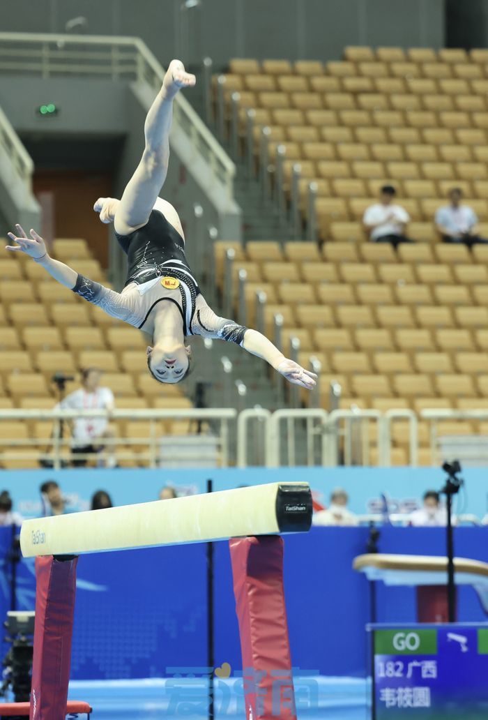 韦筱圆,2004年8月25日出生于广西壮族自治区南宁市,中国女子体操运动员,2017年,韦筱圆入选中国女子体操国家队,韦筱圆五官精致,长相甜美,在比赛中总是扎着一个大大的蝴蝶结,被称为“蝴蝶结妹妹”。(爱济南 记者:王佳慧 摄影:张锋 张刚 刚永超)