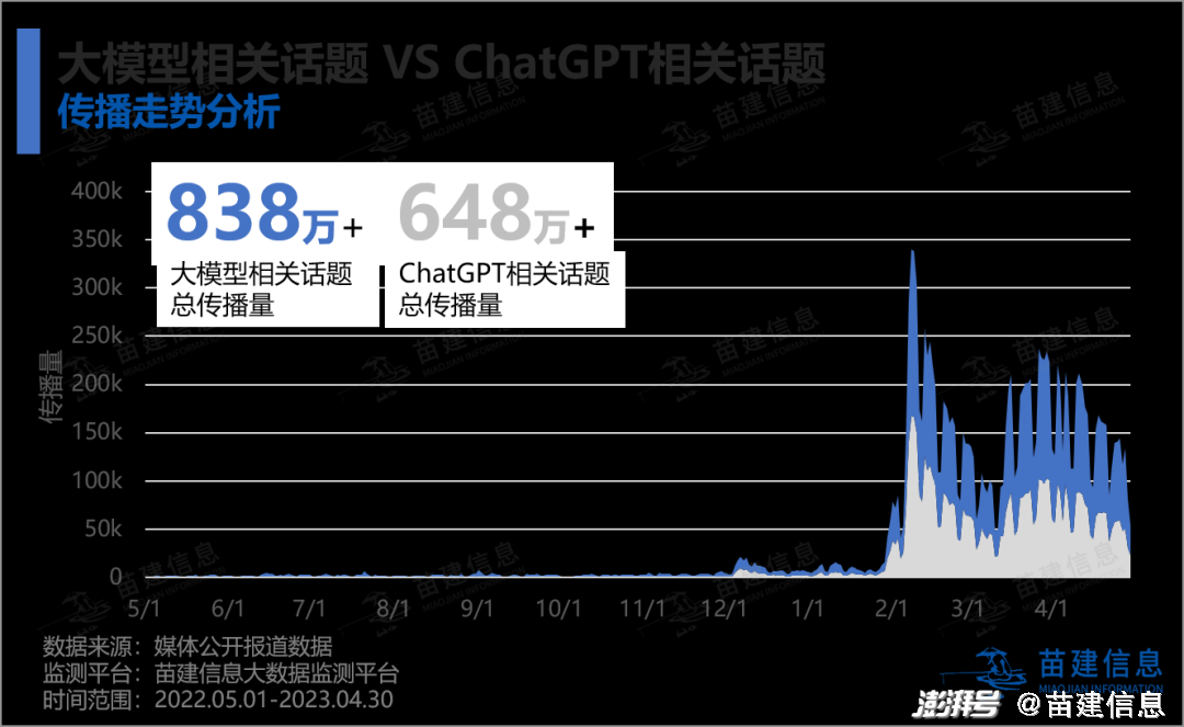 从监测数据走势来看,2023年初,ChatGPT在国内互联网上越来越多的被提及,AI大模型等相关话题从1月份开始稳步上升。2月份随着春节假期的结束,ChatGPT、OpenAI迅速出圈引发大范围舆论关注。受其影响,3月份开始国内多家企业相继宣布发布或布局大型语言模型,大模型相关声量持续攀升。