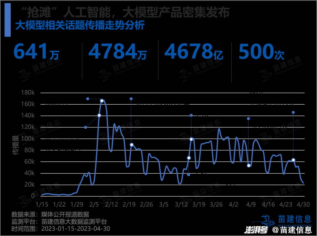 ChatGPT发布以来,AI大模型竞赛逐步进入白热化阶段,国内外科技巨头纷纷布局。根据苗建信息大数据平台监测显示,今年2月份以来国内正式宣布布局或发布大模型产品的企业超过30家。