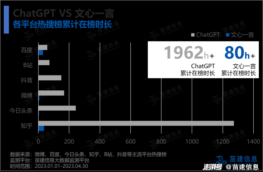 从热度榜单相关数据来看,ChatGPT的社会影响力和热度显著超过文心一言。但两者在不同平台的表现存在差异: