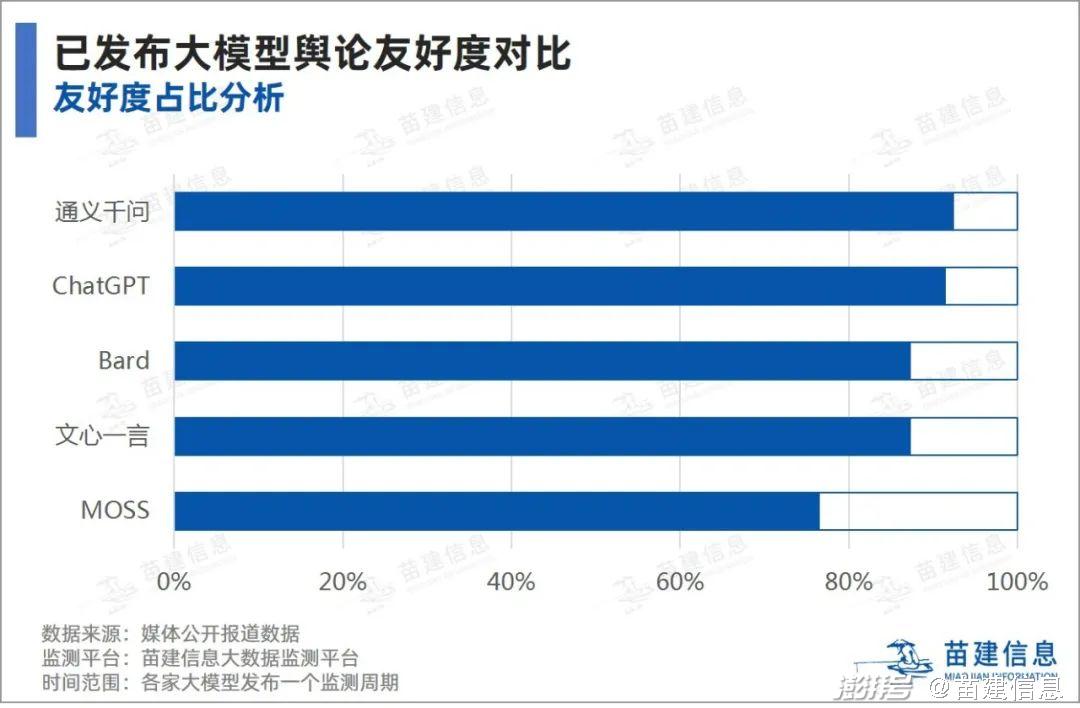 对比已发布体验的大模型,从友好度占比来看,MOSS由于一开始就面临技术实力与社会期待不匹配的困境,被外界质疑最多。外界对百度文心一言的质疑则主要源于发布会上的失望表现和主动调低外界预期。对谷歌Bard的质疑则主要在于外界报道谷歌员工指出推出Bard的方式过于“仓促”、简直是“一团糟”,同时因为Bard目前不支持中文,同样也引发指责。相比之下,通义千问和ChatGPT则有较高的舆论友好度,整体上受到较为正面评价。