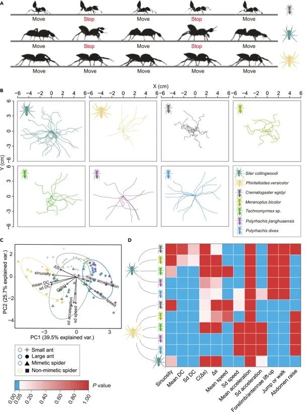 ▲图2 A 蚂蚁、科氏翠蛛、非拟蚁跳蛛的整体行为模式,蚂蚁和科氏翠蛛显示出“走走停停的”模式;B 两种跳蛛和五种蚂蚁的轨迹;C基于蜘蛛和蚂蚁的运动轨迹和运动速率相关参数的主成分分析结果显示科氏翠蛛与蚂蚁的运动相似度很高,而非拟蚁跳蛛的相似度最小;D 科氏翠蛛和假定的蚂蚁模型之间的运动相似性总结,支持了多模型假说。
