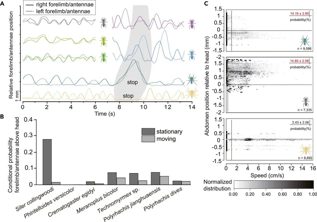 首先,科研人员将科氏翠蛛的行为特征与假定的蚂蚁拟态对象和非拟态蜘蛛的行为特征进行了比较(图2,3)。发现科氏翠蛛在轨迹特征、运动速度、腹部摆动和抬前足等方面的行为特征与多个蚂蚁物种高度相似,表明科氏翠蛛通过行为要素动态地模仿了与其共存的多种蚂蚁。该分析结果支持了不完美拟态理论中的多模型假说,证明科氏翠蛛通过提高动态拟态的相似性以改善静态视觉要素上与拟态对象的差异。
