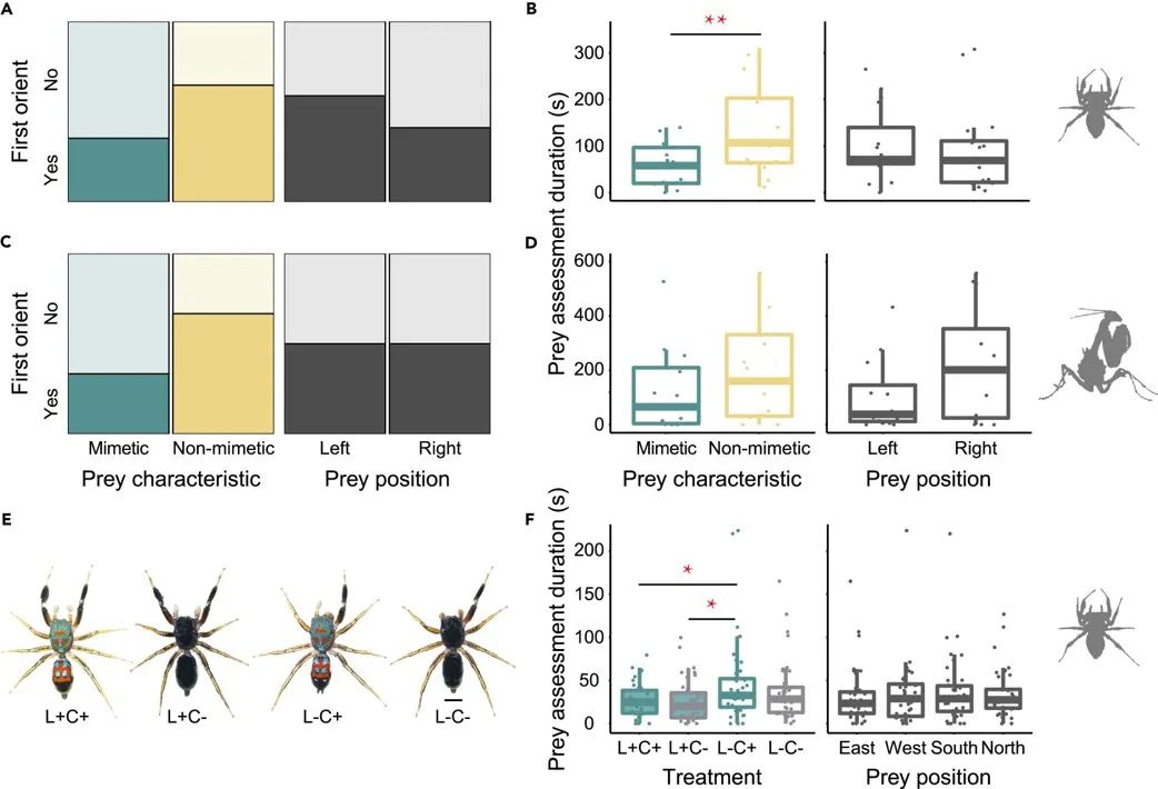 ▲图4 以跳蛛视角进行蜘蛛和植物之间的反射光谱和颜色对比。A科氏翠蛛、非拟蚁跳蛛和蚂蚁的主要颜色斑块的图示;B寄主植物的彩色斑块;C所有被测物种的反射光谱;D色彩对比。结果显示科氏翠蛛比非拟蚁跳蛛有更好的伪装效果。最后,研究人员以专食蜘蛛的捕食者跳蛛和食性广泛的螳螂作为天敌进一步开展了反捕食实验(图5),结果表明科氏翠蛛结合运动模仿和背景匹配可有效降低其被捕食的风险,从而揭示了这种不完美拟态的贝氏拟态的本质。