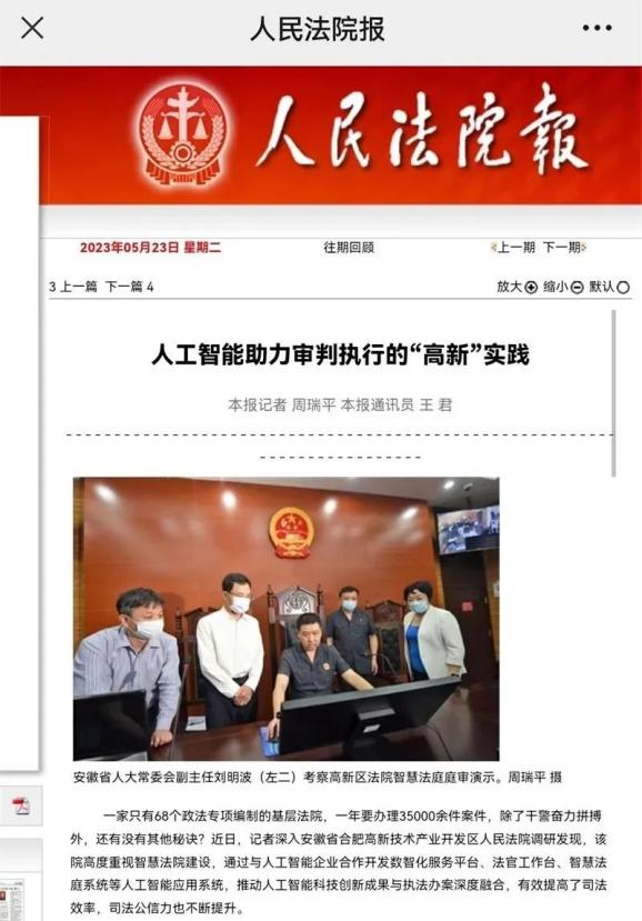 5月23日,《人民法院报》整版报道了合肥高新区法院智慧法院建设工作。近年来,该院通过与人工智能企业合作开发数智化服务平台、法官工作台、智慧法庭系统等人工智能应用系统,推动人工智能科技创新成果与执法办案深度融合,有效提高了司法效率,司法公信力也不断提升。