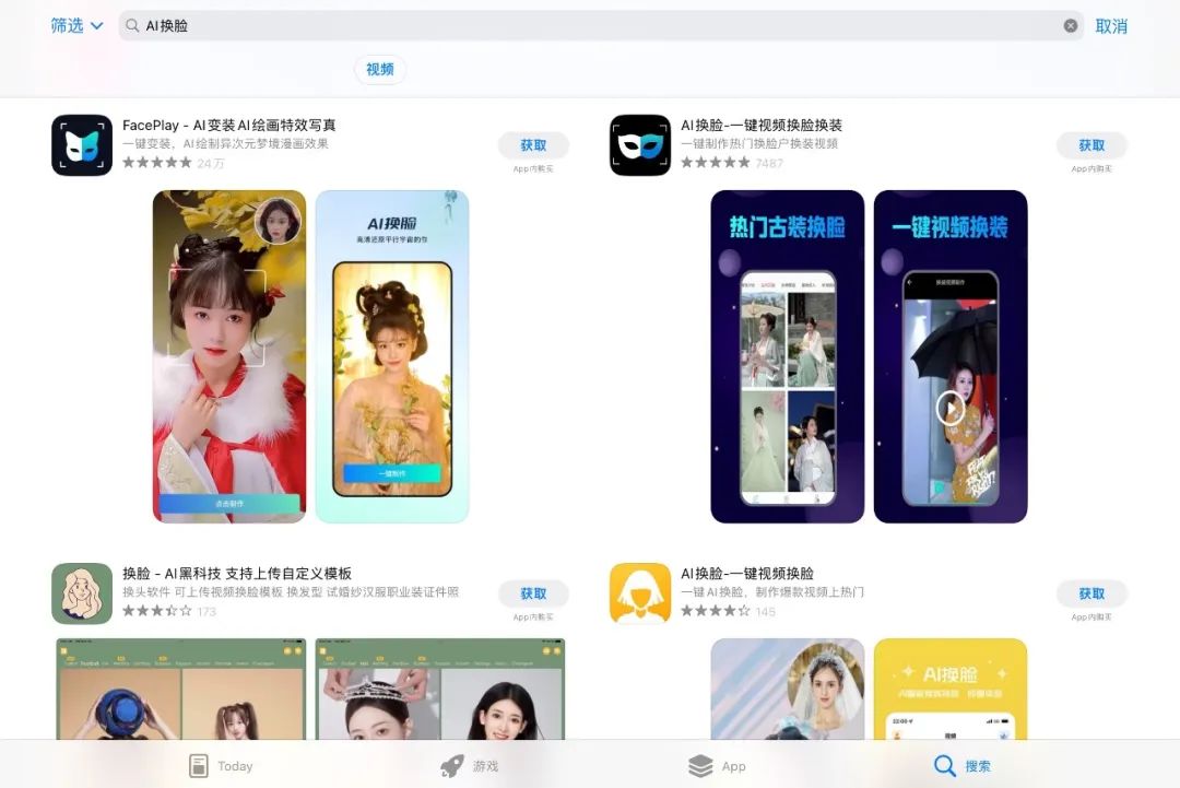 ▲App Store中有近百款“AI换脸”应用程序早些时候,一位名为“特效合成师洪亮”的视频博主在自己的视频中,将电视剧《你是我的荣耀》中男主演杨洋的脸,通过AI换脸技术换成了自己的脸,最终遭到主演粉丝的追打,从而引起了不少网友的注意。