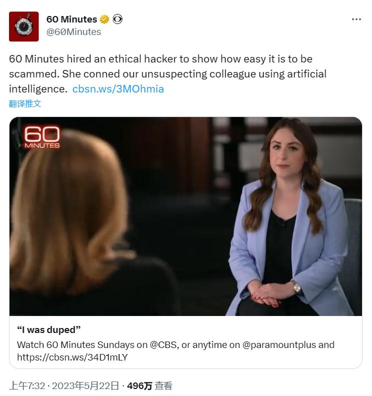 ▲60 Minutes在推特中上传了完整视频仅用了5分钟时间,黑客就通过AI克隆复制了Sharyn的声音,并通过工具替换了手机上来电显示的名称,成功骗过了她的同事,轻而易举地得到了她的姓名、护照号码等私人信息。