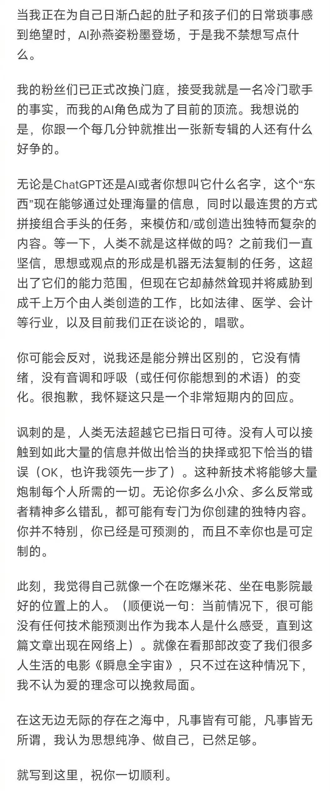 近日爆火的孙燕姿在昨晚对“AI孙燕姿”的出现发长文给予回应。