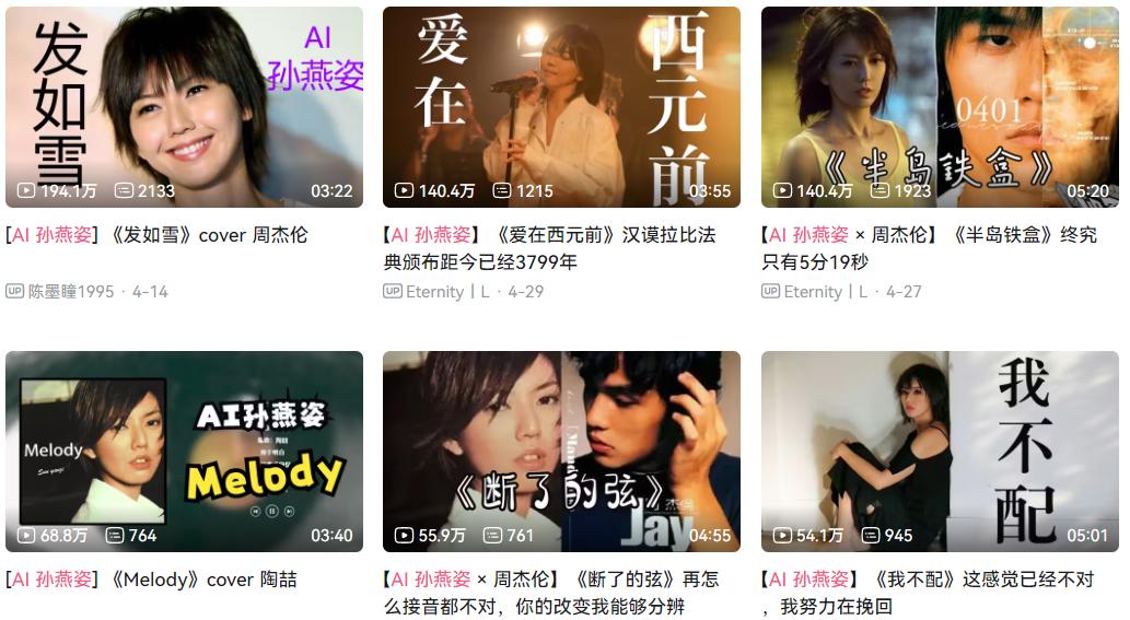 ▲“AI孙燕姿”播放量排行靠前的几首歌曲而孙燕姿也并非是唯一一位被“AI翻唱”的歌手,还有AI周杰伦、AI王心凌、AI腾格尔等人陆续出现。