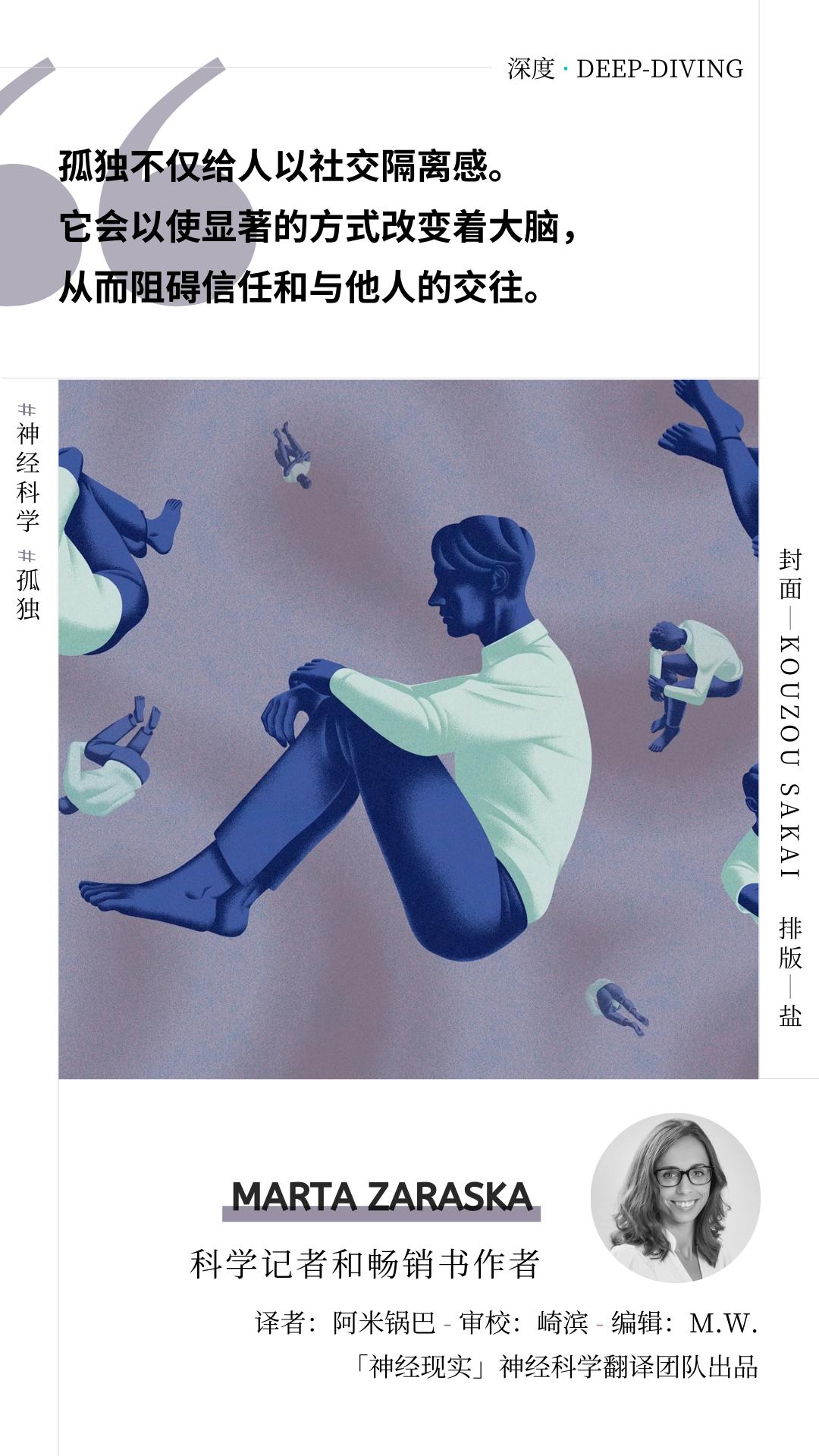 - Kofash -神经科学表明,孤独并不一定是由缺乏接触他人的机会,或害怕社交互动造成的;相反,我们大脑神经环路的改变和行为的变化可能将我们困在“第二十二条军规”一般的窘境中:尽管我们渴望与他人建立联系,但我们眼中的他人却是不可靠、具有批判性和不友善的,于是我们选择与他们保持距离,并有意或无意地将与他人建立联系的潜在机会拒之门外。