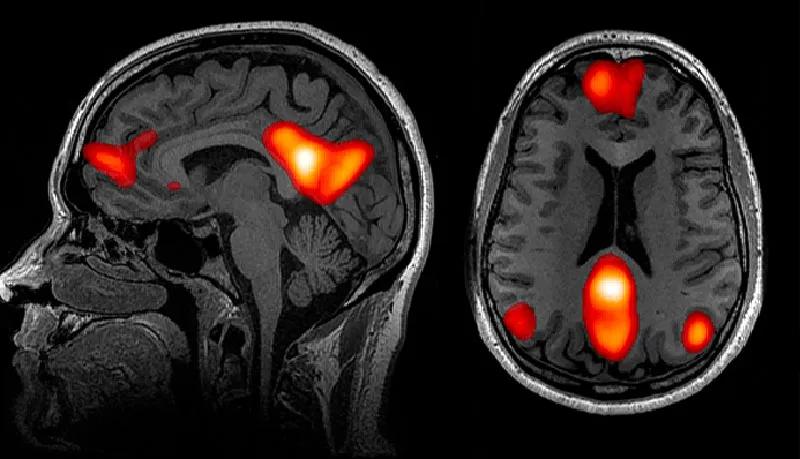 人脑的功能磁共振成像揭示了与默认网络相关的一些区域——当我们想到他人时最活跃的神经中枢区域。—