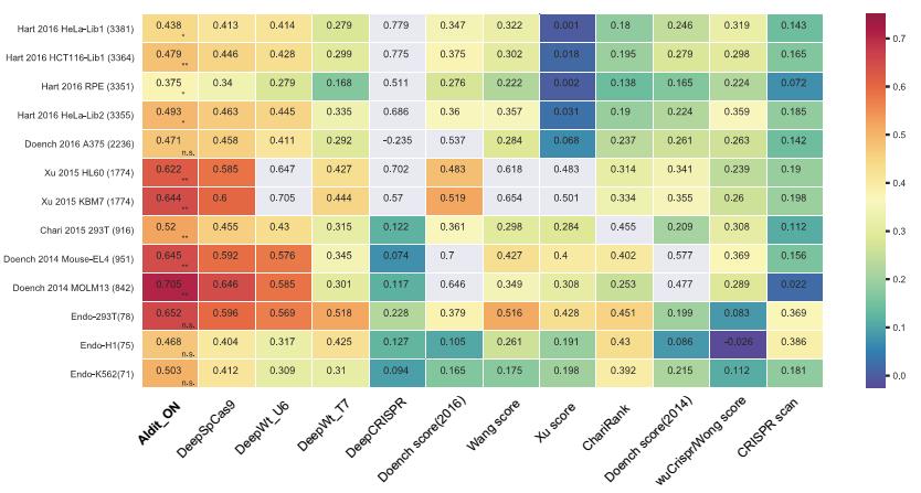 图2:建立预测gRNA活性的AIdit_ON模型的流程图为了进一步评估AIdit_ON模型在不同细胞类型中的泛化性能,研究人员基于多个公开可用的内源数据集,比较了AIdit_ON和11个已发表的计算工具,结果显示AIdit_ON模型在所有公共数据集中的表现要优于所有其他模型(图3)。同样地,对于本研究产出的不同细胞系内源的gRNA活性数据(293T n=78;K562 n=75;H1 n=71),AIdit_ON模型的表现也优于其他模型(图3)。