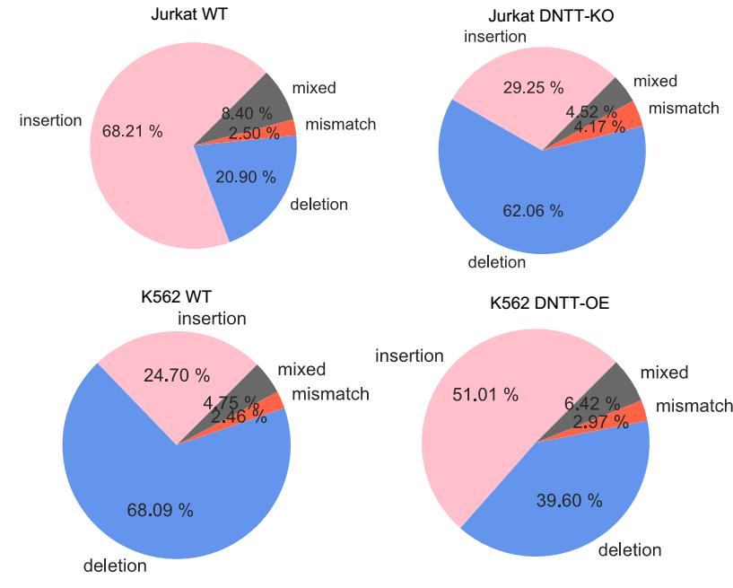图3:不同数据集的indel频率和12个模型预测效率之间的Spearman相关系数的热图此外,K562和Jurkat细胞中740k文库的数据集使研究人员能够进一步检测这两种细胞类型中DSB(DNA双链断裂)诱导的基因组修复结果。在仔细分析Jurkat和K562细胞的DSB修复图谱时候,研究人员有了意外的发现。在K562中,超过65%的SpCas9/gRNA诱导的DSBs被修复为缺失类型(Deletion),这与以往研究的大多数细胞类型中发现的现象一致。相反,插入(Insertion)在Jurkat细胞中占主导地位(大于60%)(图4)。研究人员大胆假设,Jurkat细胞的一种独特特性可能是导致Insertion主导修复结果的原因。经过验证,研究人员证实了他们的猜想,他们找到了一个在Jurkat特异性高表达的基因DNTT,该基因是控制Jurkat中DSB修复的主导基因。敲除Jurkat中的DNTT会改变其修复结果,使其与K562细胞的修复结果更相似。相反,在K562细胞中过表达DNTT时,Insertion成为最主要的DSB修复图谱。这些数据表明,由SpCas9/gRNA介导的DSB诱导的修复结果是DNTT依赖性的。