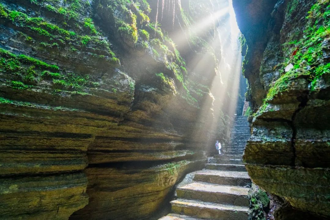 地心谷地心谷,一处隐藏在峡谷中的山水画廊,是典型的喀斯特岩溶嶂谷地貌,有着地心归来不看谷的美誉。沿途处处可以看到峡谷溪流的自然风光,碧绿清澈的潭水,仿佛来自地球的深处,惊叹于大自然的鬼斧神工,奇景秀丽,秘境清幽。