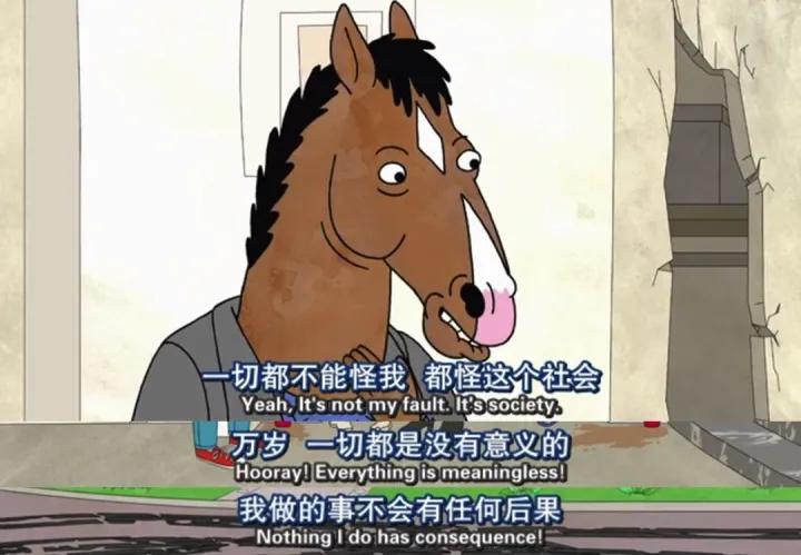 马男波杰克,毒舌、懒惰、虚荣、自私、玩弄感情、逃避现实……全网最红、最讨人“喜欢”的渣男。(图/《马男波杰克》)每当他觉得人生要出现转机时,现实总会再狠狠地将他打倒,他感到人生无望,做什么都是白费功夫。于是终日酗酒麻醉自己,把一切怪罪于这个世界。