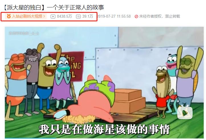 B站的镇站鬼畜视频之一“派大星的独白:一个关于正常人的故事”,至今已累积了高达8000多万的播放量、500多万点赞,在深夜抚慰了不少成年人EMO的灵魂。