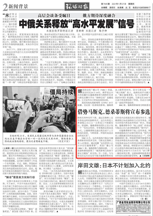 对德桑蒂斯将于线上宣布参选,特朗普超级政治行动委员称其是“现代历史上最脱离实际的竞选活动之一”。《华盛顿邮报》称,特朗普背着刑事案件及其他各种悬而未决的问题,这些都会成为他角逐2024年共和党总统候选人提名的变数。据报道,特朗普23日以视频形式出席纽约曼哈顿刑事法院的听证会,法官暂定2024年3月25日为“封口费”一案的审判日期,这意味着特朗普将在共和党初选期间接受审判。(王佳琳)