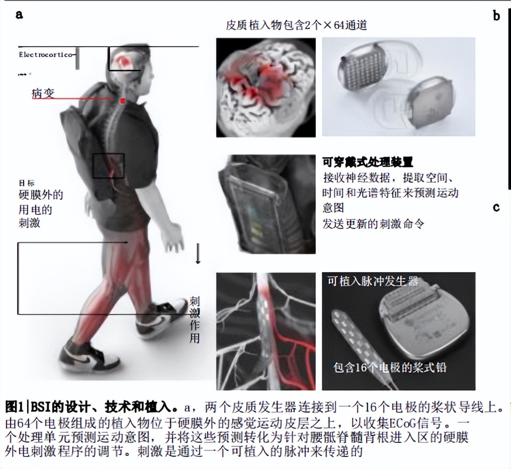 BSI的设计、技术和植入。图片来源:库尔廷团队论文随后,解码的运动意图被转换为刺激命令,该刺激命令被传输到定制软件中。这些命令被传递到ACTIVA RC植入式脉冲发生器,该植入式脉冲发生器常用于传递帕金森病患者的脑深部刺激,库尔廷团队升级了该植入物,使其可实时调整硬膜外电刺激的位置和时间,然后使用指定的植入式导线将电流传递到目标区域。