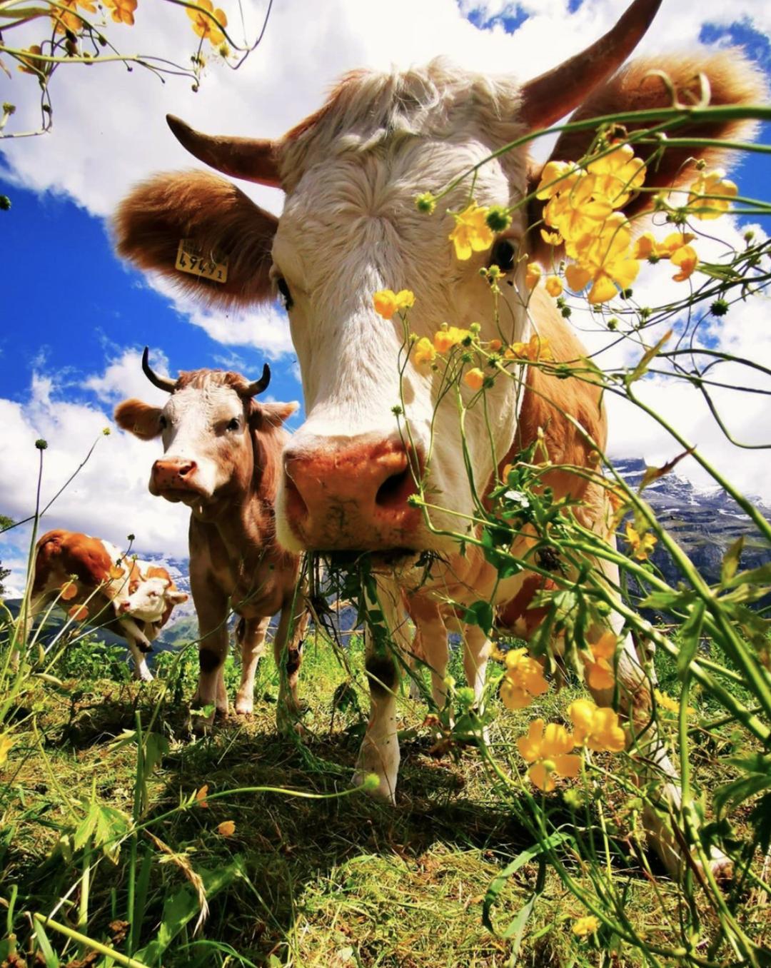 瑞士奶牛们的伙食也是极好的,尊享高档自助餐。高原山地的草甸上生长着多种无污染牧草,比如被誉为最佳奶牛牧草的黑麦,瑞士三叶草、菊苣、车前草等等,以及凝聚着天地精华的花朵。
