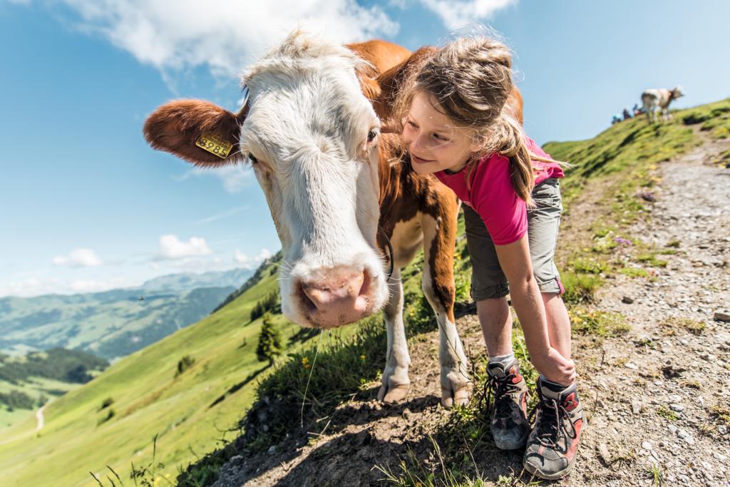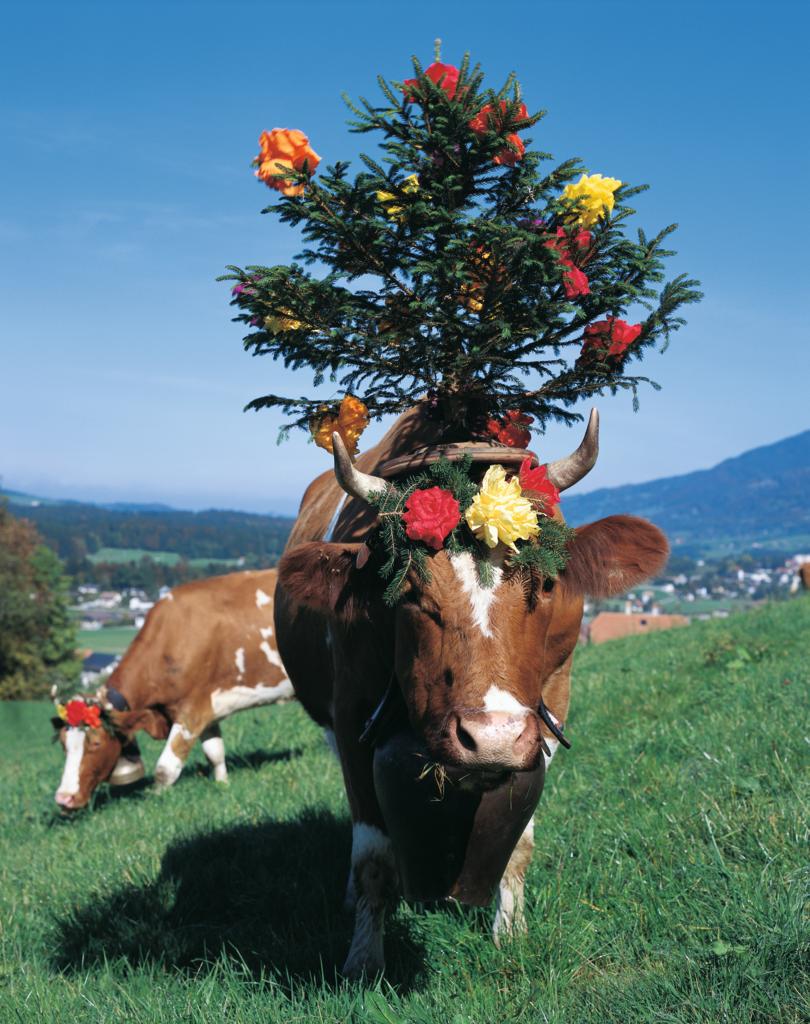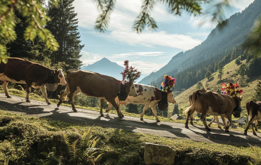 六至九月是奶牛们撒欢过暑假的日子。盛夏正值高山上的牧草和鲜花野蛮生长,赶牛上山节(Almaufzug)期间,牧民们就把自己家的奶牛带到阿尔卑斯山上散养,让牛牛吃最鲜嫩的原生态牧草,睡最松软的大草甸。(如果你知道今年赶牛上山节的具体日期,欢迎在下方留言,分享给更多想去看奶牛的朋友们呀~)