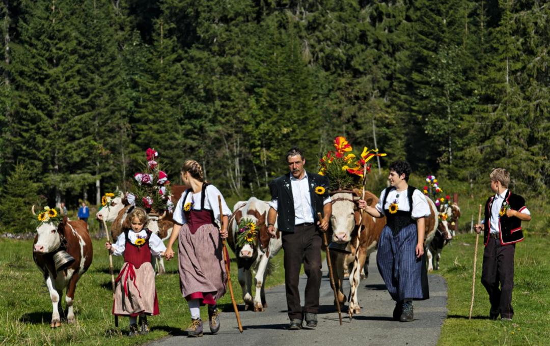 全瑞士大约有1/3的奶牛可以上阿尔卑斯山区吃草。夏天,阿尔卑斯山上牧民的工作是把牛赶到牧场,每天给它们挤两次奶,然后做奶酪。为了让牛牛们放松度假,人们还会减少这段时间的挤奶量。: myswitzerland.com盛装出席下山时装秀