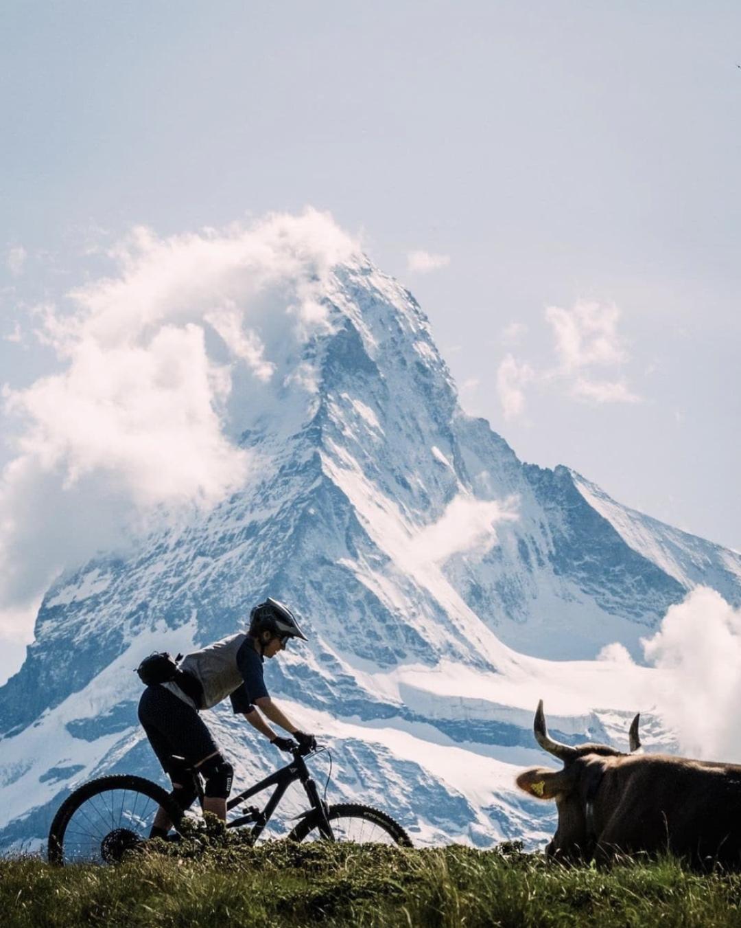 如果牛牛知道自己产的奶融化在瑞士享誉世界的三角巧克力(Toblerone)里,而那款巧克力的包装图案和形状就是自己眼前巍峨的山峰,路过骑车的人类也很喜欢吃三角牛奶巧克力,会不会很有成就感?