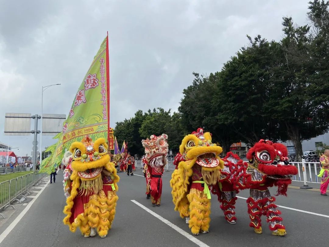 △龙狮方阵由伍丁先师宝诞主旗、伍丁牌匾、龙狮和开道锣鼓组成。以上三图 杨乐祺 摄