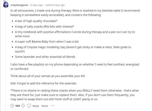 当我需要感到舒缓、恢复活力或得到安慰时,我也会在手机上听对应歌单的歌曲。当你组装你的宝箱时,记得考虑你不同感官的需求(视觉、味觉等)”
