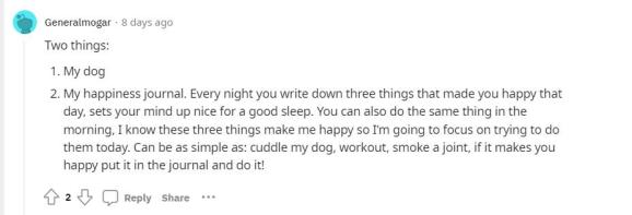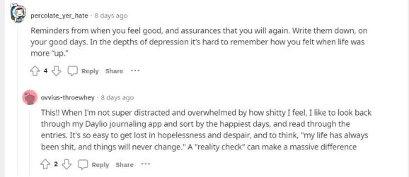回复:“这一点我太赞同了。当我没有被糟糕的感觉所困扰和淹没时,我喜欢通过我的手机写日记,把事件按照那些感到快乐的日子进行分类。当我们感到不开心时,很容易迷失在无望和绝望中,并认为 "我的生活一直很糟糕,事情永远不会改变"。这时,重新看看你的日记可能会带来意想不到的变化。”