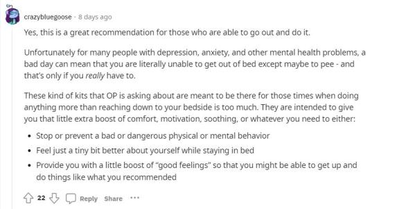 “以上那些建议对于大部分人都很好。但不幸的是,对于许多有抑郁症、焦虑症和其他精神健康问题的人来说,糟糕的一天可能意味着你无法下床,哪怕是如厕也困难重重。