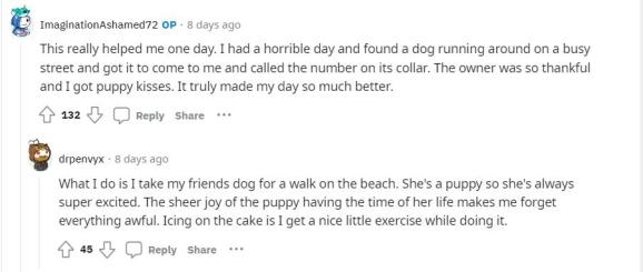 回复:“我曾经带我朋友的狗到海滩上散步。这还是一只小狗,所以她总是超级兴奋。小狗享受生活的那股纯粹快乐让我忘记了一切糟糕的事情。锦上添花的是,我在遛狗的时候也算是一种小小的身体锻炼。”