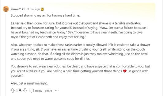 你应该规律饮食,穿干净的衣服,住在一个让你舒服的空间。但如果你很难让自己做到这些事情,你也不是失败者❤️。请对自己温柔一些。