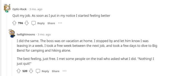 回复:“我就是这样做的。我曾经告诉老板我要请假一周,随后我去不同地方远足、潜水和露营。自由的感觉真是太美妙了!我在旅途中遇到的许多人常常问我怎样才能这么开心,我的回答是,我什么也没做,只不过是离开工作了。”