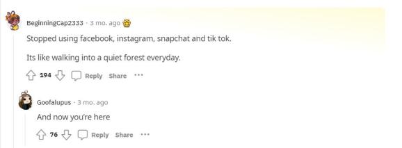 “不再使用社交媒体。这让我感觉就像走进一片寂静的森林。”