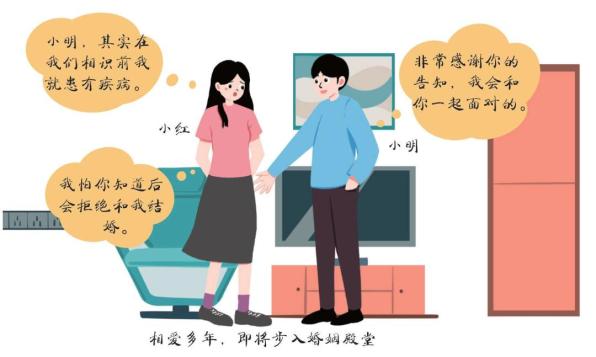 例1:小明与小红相爱多年,即将步入婚姻的殿堂。在筹备婚礼期间,小明发现小红常常闷闷不乐,甚至有时候莫名其妙地哭泣和发脾气,小明一度以为两人感情出现了问题。在小明的追问下,小红只好向小明坦白,原来小红患有医学上认为不宜结婚的遗传性疾病,担心小明知情后,会拒绝与她结婚。小明对小红的如实告知感到欣慰,决定与小红共同面对。