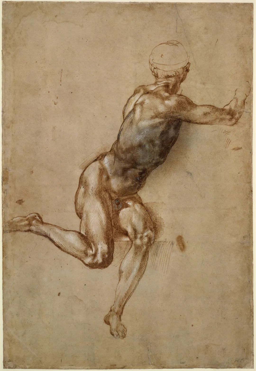 米开朗基罗很可能先让模特朝一个方向摆好姿势,画下他的腿和腹股沟,然后让模特稍稍转动以画下头、手臂和肩膀。证据就是其中的技法:人体上部和下部用蘸水笔和墨水绘制,并精心点缀了白色高光,但躯干的部分融合了淡彩等多种媒介,说明米开朗基罗对躯干进行了多次修改,以找到连接上下两部分人体且令人信服的肌肉结构。最后他得到了一个理想化的人体,我们并不能在自然中看到,但它也诞生于对自然的研究。