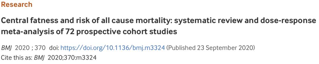 [1]Jayedi A, Soltani S, Zargar MS, Khan TA, Shab-Bidar S. Central fatness and risk of all cause mortality: systematic review and dose-response meta-analysis of 72 prospective cohort studies. BMJ. 2020 Sep 23;370:m3324. doi: 10.1136/bmj.m3324. PMID: 32967840; PMCID: PMC7509947.